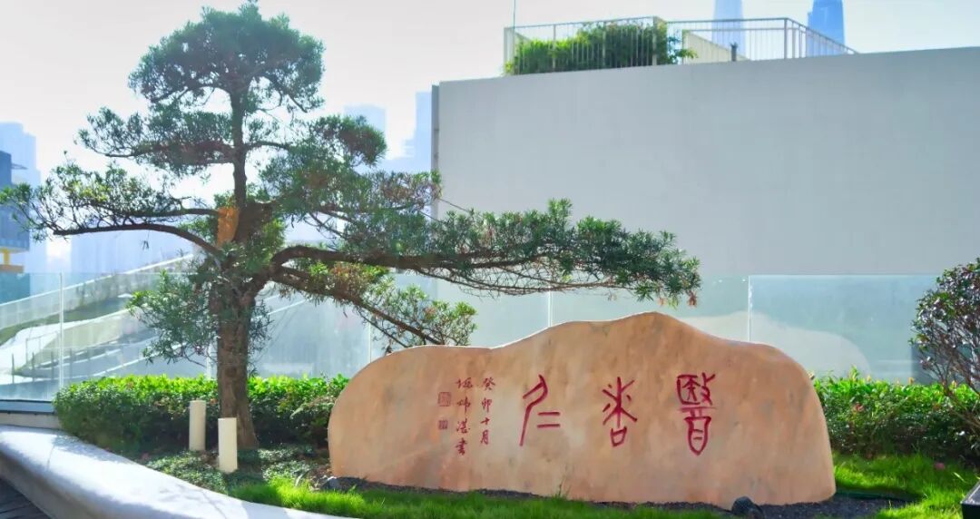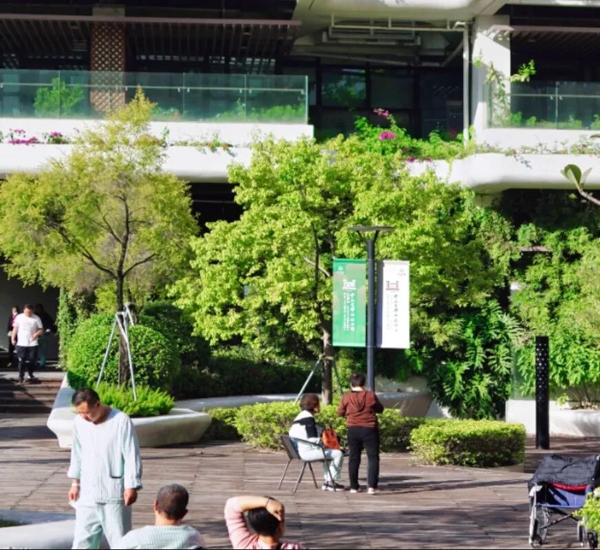 7楼空中花园“仁者医”碑石前,患者、家属闲庭信步,好不惬意~网友点评:梦幻温馨的“五星级酒店”入住体验。