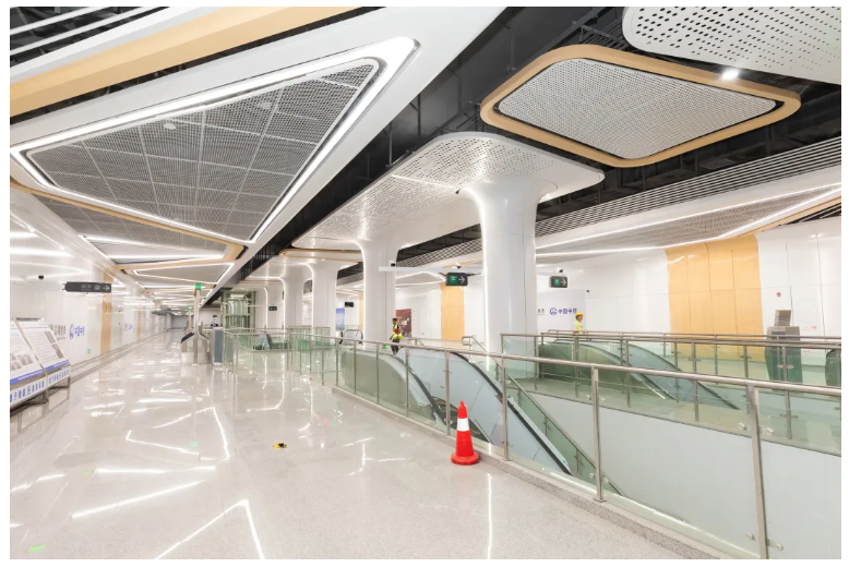 福星站采用大镂空设计,结合精巧的天花与渐变冲孔板,提升车站空间感,呈现和谐美学。这一设计不仅提升了车站的美观度,也为市民提供了更加舒适的候车环境。