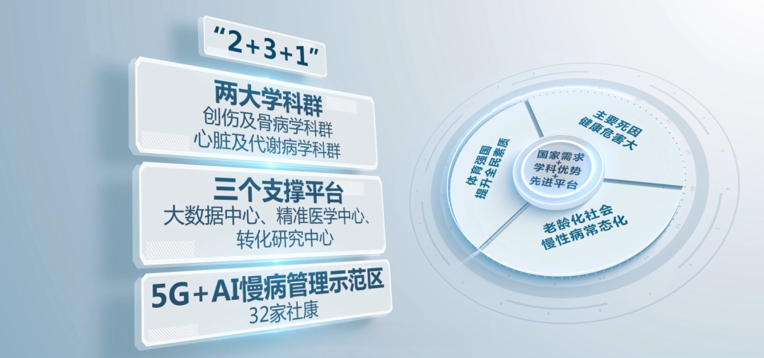 医院坚持以患者为中心,以学科建设为工作主线,立足中山大学“双一流”战略布局,着力打造“高精尖国家队”。全面提升医疗服务能力,形成了创伤及骨病学科群和心脏及代谢病学科群两大学科群,打造大数据中心、精准医学中心和转化研究中心三个支撑平台。依托32家社康,建设5G+AI慢病管理示范区,构建“顶天立地促健康”的全民健康服务体系。