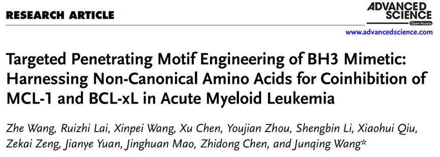 近日,中山大学附属第八医院病理科王哲团队与中山大学药学院(深圳)王俊卿团队合作,在国际综合性期刊《Advanced Science》(中科院一区TOP,IF = 14.3)上发表了最新研究成果,题为“Targeted Penetrating Motif Engineering of BH3 Mimetic: Harnessing Non-Canonical Amino Acids for Coinhibition of MCL-1 and BCL-xL in Acute Myeloid Leukemia”。该研究重点设计并开发了一种靶向性强、高效且脱靶效应低的BH3模拟肽vMIP-II-TAT-I,有望克服当前急性髓系白血病(AML)治疗面临的耐药挑战。