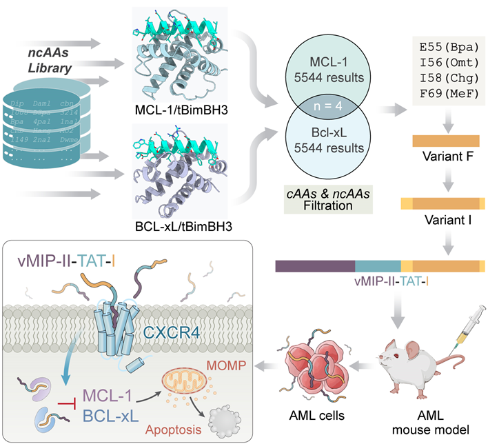 针对这一难题,中大八院王哲团队重点设计能同时抑制MCL-1和BCL-xL这两个关键耐药靶点的新型多肽药物,成功开发了一种工程化BH3模拟肽vMIP-II-TAT-I,利用非天然氨基酸增强了其对MCL-1和BCL-xL的双靶点结合能力,并通过引入靶向穿透基序提高了对AML细胞的特异性和摄取效率。这一创新策略有效地克服了当前AML治疗中常见的Venetoclax耐药问题,为白血病靶向治疗提供了新的思路和工具。